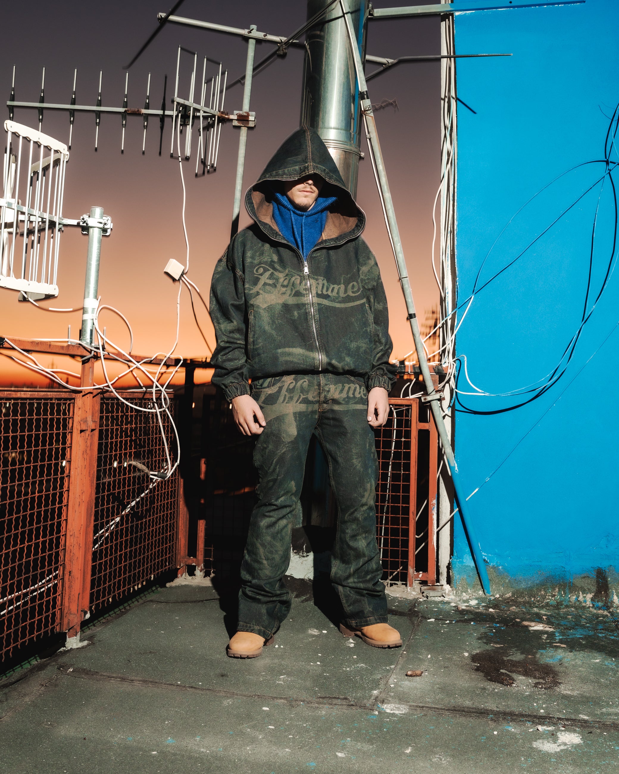 Jeans in denim scuro con incisione laser con logo Effemme frotnale tono-su-tono, parte della capsule "Freedom in Chain". Design pulito, identità forte.